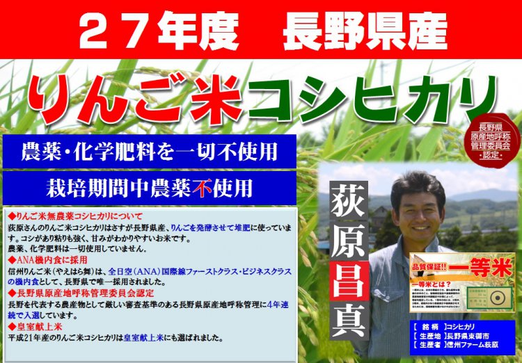 荻原さんのりんご米コシヒカリはさすが長野県産、りんごを発酵させて堆肥に使っています。
